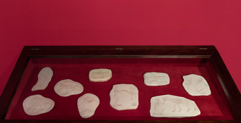 Sabun üzerine saçlar ile çizilmiş iskelet biçimleri, deformasyona uğramış bedenler, deney hayvanlarına atıfta bulunan fare figürleri bizi uzak görünen yakın gelecekle tanıştırıyor. Sanatçı, fosil ve kalıntıların erken dönemi çağrıştırması yargısını yıkarak baktığımız manzaranın geleceğin habercisi olduğunu düşünmemizi sağlıyor.