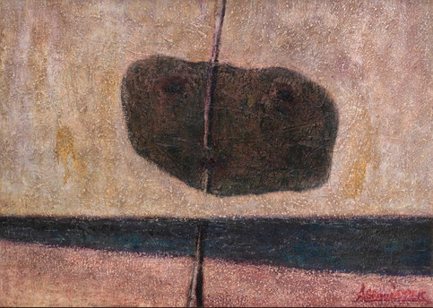 Kapı/duvar dizileri ise mimarinin en açık okunduğu resimler. Dikey yarıklar —ister gerçek bir kapı aralığının izdüşümü, ister taş yüzeyde bir çatlak olarak düşünün— soyut yüzeyde akış kanalları. Renk, o kanallara doğru çekiliyor; boşluk, boyanmamış bir “eksik” olmaktan çıkarak, sahici bir öğeye dönüşüyor. Hatta duvar bir eyleme dönüşüyor diyebiliriz.