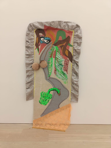 Nilbar Güreş, Kadife Bakış, Sergiden görünüm, 2025, Arter. Fotoğraf: Kayhan Kaygusuz Önde: Nilbar Güreş, Kadife Bakış, 2020, Kumaş, makrame, 366 x 340 cm