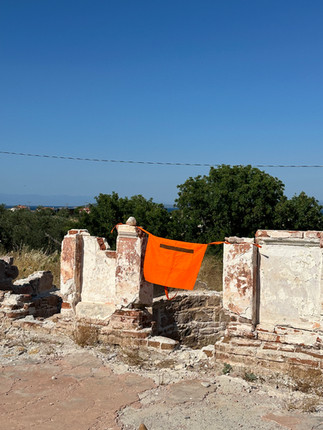 “Askıda Ev benim gündelik tatil hayatımda olanla tarihsel olan arasında kurduğum ince bir gerilim. Bir zamanlar iç mekana ait olan her şey şimdi dışarının rüzgarına teslim. Rüzgarla bir koreografi içinde dans eden bu önlük artık ne bir vücuda ait ne de bir işlev içinde. Sadece asılı ve kendi başına. Sahipsiz, sahipsizliğiyle konuşan bir karşı- anıt gibi.
