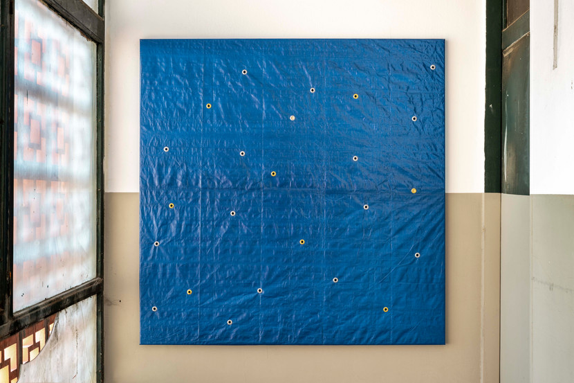 Birinci Bölüm’e uzanan süreçte gerçekleşen Giriş sergisinde, İMÇ’de satılan parke görünümlü plastik kaplamalardan ağaç kütüğü şeklinde bir tabure üreten Duran, yine benzer bir malzeme dönüştürme süreci izleyerek, Rast adlı yerleştirmesi için plastik bir brandayı tuval şasesine geriyor ve geleneksel resim sanatına göndermede bulunuyor. Her yerde karşımıza çıkan mavi Pilsa branda, özellikle manav ve kamyonların ayrılmaz bir parçası haline gelmiş yaygın bir malzeme. Daha önce sanat bağlamında belki sokak fotoğrafçılığıyla karşımıza çıkmış, arka plan rengi için beğendiğimiz branda, şimdi tuval şasesine gerilerek bir yandan değerleniyor, bir yandan da işlevsizleşiyor.