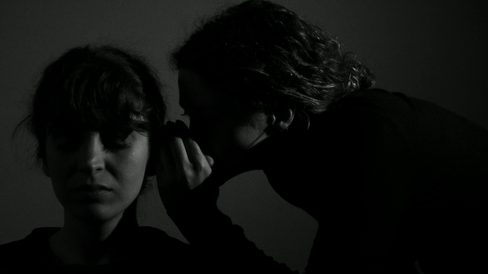 Sağda: Hilal Balcı, Kulaktan, 2023, Video performans, 00.37 dakika