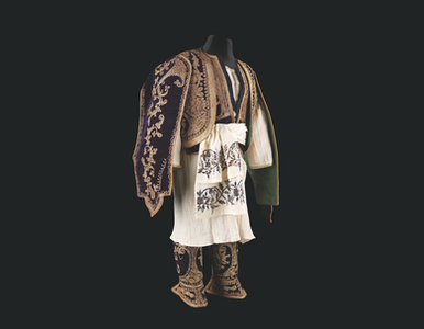 Solda: Cepken-yelek-tozluk, Osmanlı, İstanbul, 19. yüzyılın sonu-20. yüzyılın başı, kabaddi, saten, çuha, simli kordon, balıksırtı simli kaytan