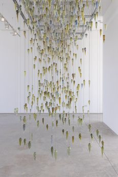 New York’a döndüğümde, bana eşlik eden haberler gittikçe artan güvensizlik ve karmaşayı işaret ederken, to carry’nin/bienalin çok sesli mekânları aklımda yankılanmaya devam ediyor. Bu sanatçı topluluğunun siyasi bir etkisi olacak mı? Bana kalırsa bu yanlış bir soru. Cécile Evan'ın distopik heykeli fantastik bir arka plan sunuyor. Birleşmiş Milletler Meclisi'nin maketleri dört adaya bölünmüş; terk edilmiş bir şehir manzarasının üzerinde yükselen minyatür koltuk sıraları boş kalmış. Evans, Ad Hoc Order (2025) adlı eserinde, tüm kişisel verilerin silindiği bir ekolojik felaketi öneriyor. CIA’in 1997’deki küresel eğilim tahmini basitçe bir duvar halısına dokunmuş durumda.